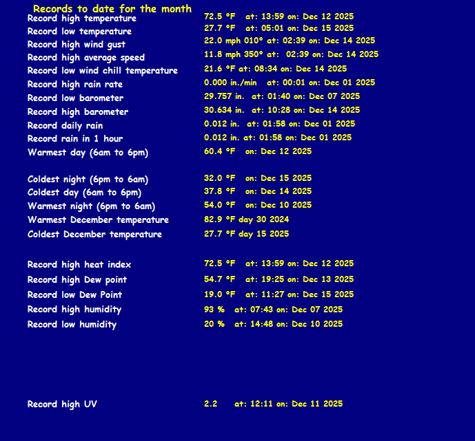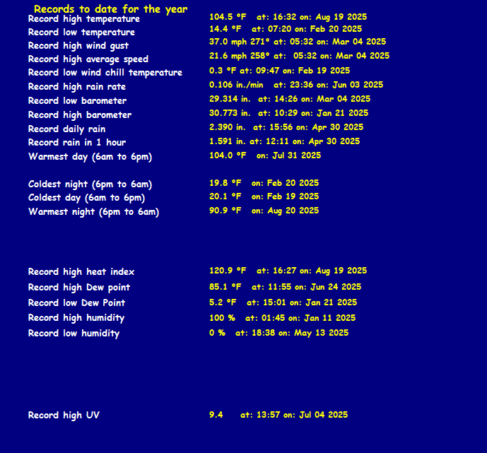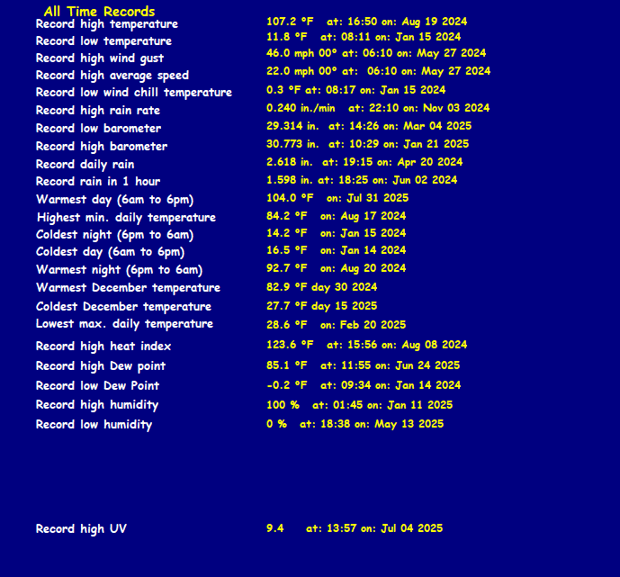 Record high temperature 107.2°F Record low temperature 11.8°F Record high gust 46.0 mph Record high average 22.0 mph Record daily rain 2.62 in. Record low windchill 0.3°F Record high barometer 30.773 in. Record low barometer 29.314 in.