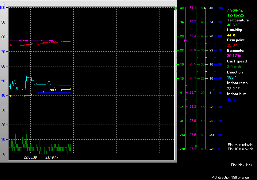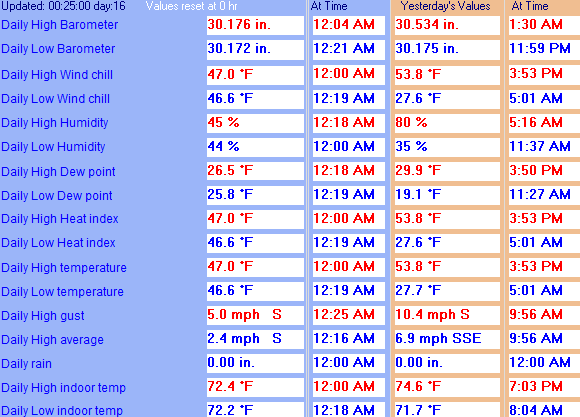 Maximum Gust (since midnight)10.4 mph at: 9:56 AM Maximum 1 minute average (since midnight)6.9 mph at: 9:56 AM